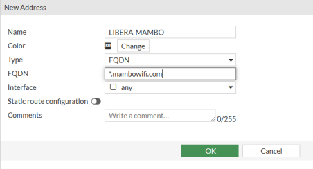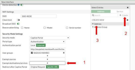 - Em Exempt Destinations/Service, clicar no “+”, em Address clique em Create como na imagem abaixo