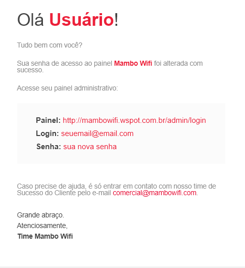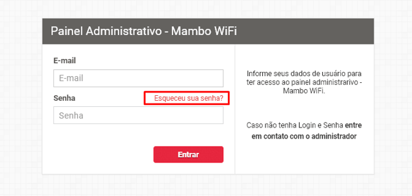 Observação: Se você não possuí um e-mail de administrador ou então não lembra qual o e-mail cadastrado, basta enviar um e-mail cadastrado para suporte@mambowifi.com informando a URL do seu painel Mambo Wifi, CPNJ ou CPF e Razão Social cadastrada conosco para procurarmos na base de dados.