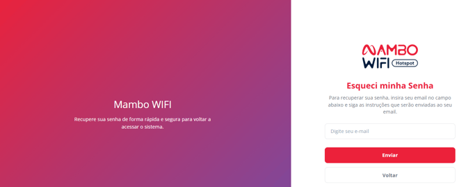 Uma nova página será carregada solicitando o e-mail de administrador já cadastrado no Mambo Wifi para que possamos lhe enviar um link de recuperação de senha: