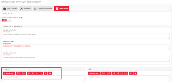 No menu Termos de Uso, você irá se deparar com 3 caixas de texto, cada uma com os termos de uso padrão nas linguagens português, inglês e espanhol. Cada caixa terá suas opções de customização, são elas: Tamanho do texto, Negrito, Itálico, Lista desordenada, Lista Ordenada, Indentar, Dessedentar, Inserir link e Inserir Imagem.