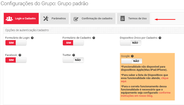 Clique em Configurações (ícone da engrenagem) referente ao grupo que deseja customizar. No exemplo será customizado os termos do grupo padrão.
