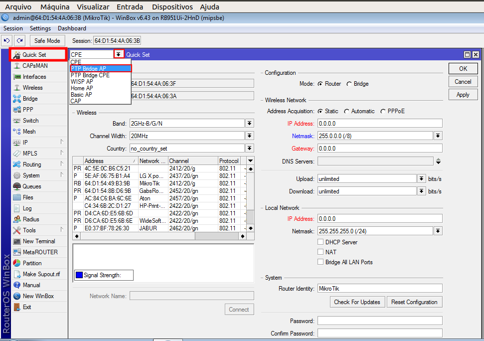 Acesse o seu Mikrotik via Winbox, vá na aba "Quick Set", clique na seta que aponta para baixo e selecione "PTP Bridge AP" conforme imagem abaixo.