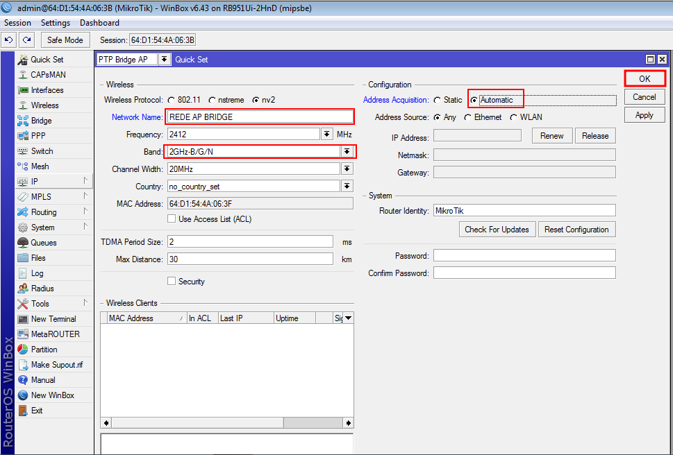 No campo "Band" selecione "2GHX-B/G/N" e em Address Acquisition" marque a opção "Automatic" conforme imagem abaixo. Clique em "OK"