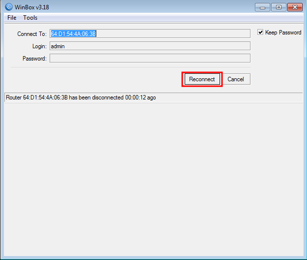 Após clicar em "OK" o WinBox irá fechar a conexão. Clique em "Reconnect" para volta ao seu WinBox.