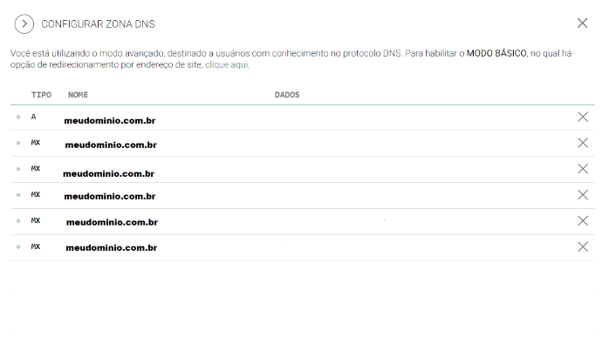 Observação: É normal que existam diversas entradas de DNS no seu domínio, não precisa remover, somente adicionar. (Não é necessário nenhum apontamento relacionado a subdomínio).