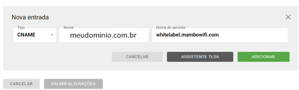 No TIPO selecione CNAME, em NOME, preencha com o domínio desejado, por exemplo "meudominio.com.br" (sem aspas), para o nome do servidor insira "whitelabel.mambowifi.com" (sem aspas), ao final clique em ADICIONAR: