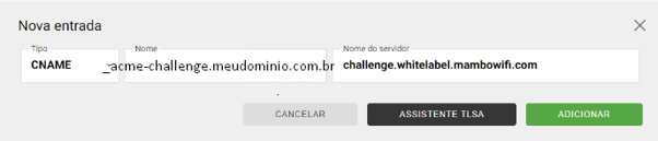 TIPO selecione CNAME, em NOME "_acme-challenge.meudominio.com.br" (sem aspas), substituindo "meudominio.com.br" pelo seu novo domínio - reproduza onde está escrito meudominio.com.br, a mesma informação inserida no NOME (realizada no passo 5) e no nome do servidor coloque "challenge.whitelabel.mambowifi.com" (sem aspas):