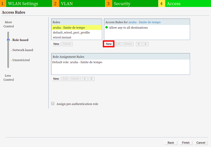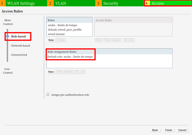 2. Vá até a aba Access, selecione em Access Rules "Role-based". Atente-se a Defeault role pois é nela que vamos aplicar o limite.