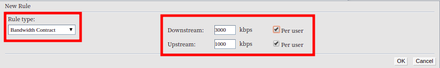 4. Irá abrir a janela conforme imagem abaixo, em Rule type selecione "Bndwidth Contract" e em Donwstream e Upstream insira o limte que deseja aplciar.