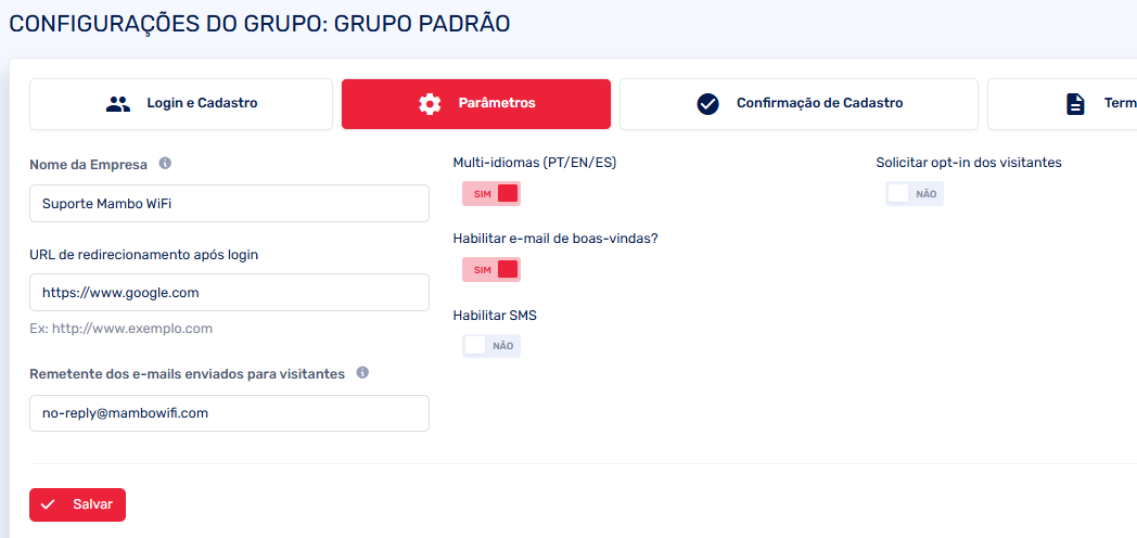 Para habilitar o e-mail de boas vindas você precisa ir até Pontos de acesso > Grupos (No caso do exemplo é o grupo padrão) > Configurações (ícone de engrenagem) > Segunda aba "Parâmetros" > e mudar para SIM a chave "E-mail de boas-vindas:"