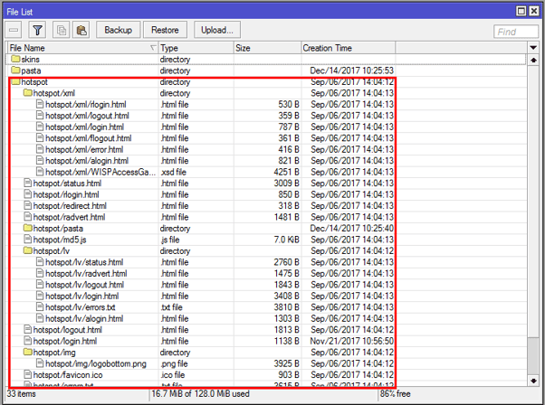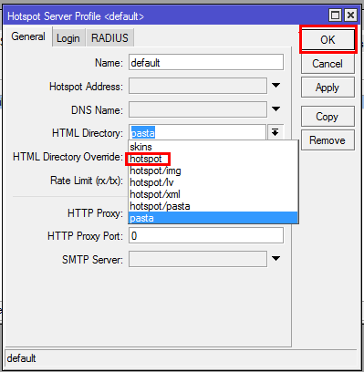 Caso a pasta esteja vazia, vá para IP → HotSpot → Servers e clique em Reset HTML: