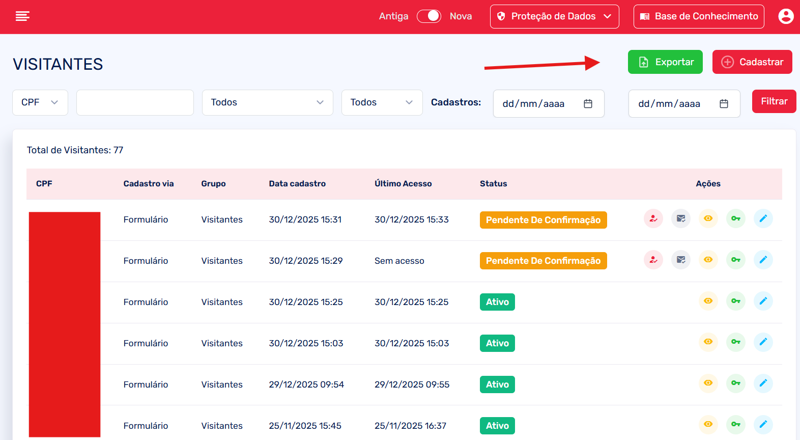 Para exportar você precisa ir até Visitantes > Visitantes (novamente)