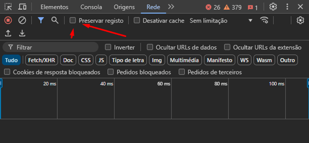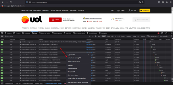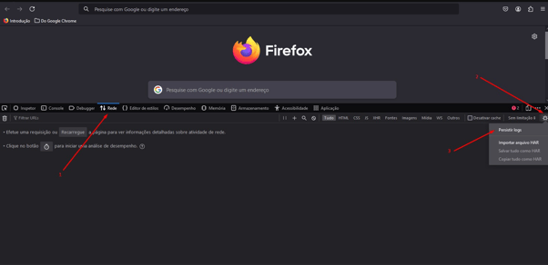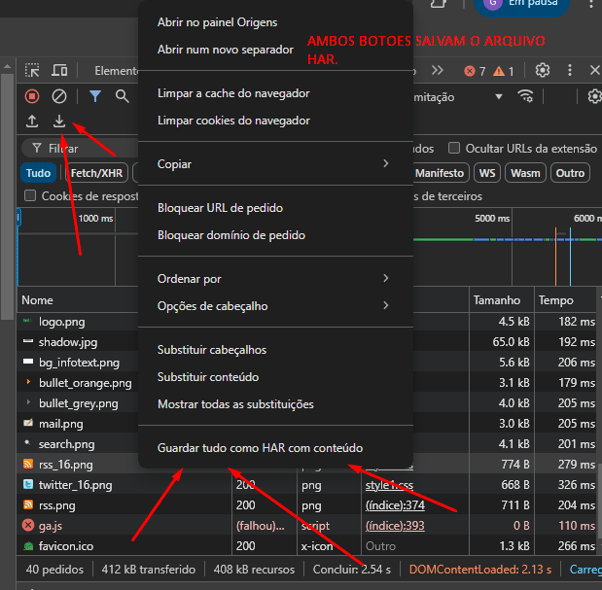 Para salvar a captura, clique com o botão direito na grande e selecione Salvar tudo como HAR. Por fim, encaminhe o HAR para a equipe de suporte.