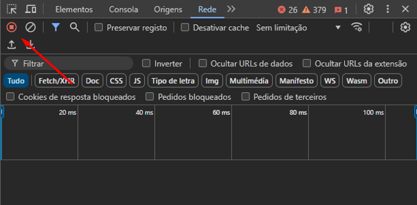 Localize um botão redondo no canto superior esquerdo da guia "Rede". Confirme que ele está vermelho. Se estiver cinza, clique nele uma vez para iniciar a gravação.