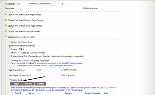 Obs: Para adicionar uma entrada, coloque o valor no campo Server e clique no botão Apply, abaixo de Walled Garden.