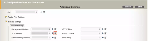 Expanda Service Settings. Em ALG Services, selecione qualquer valor diferente de def-service-alg e clique no ícone para editar: