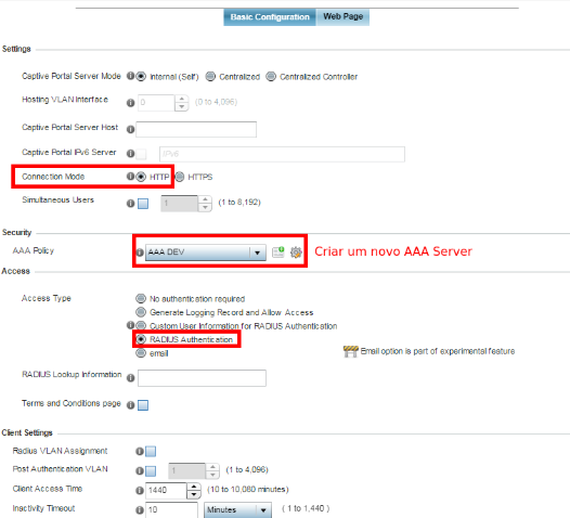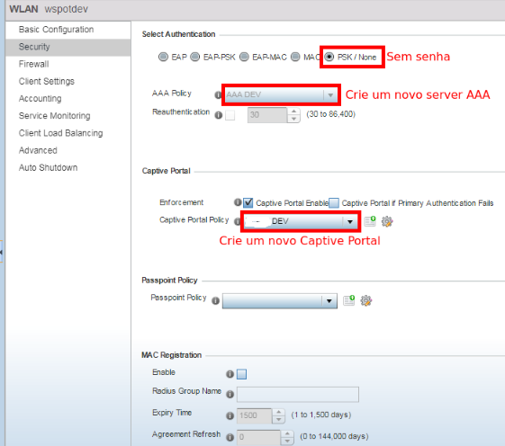 Vá para aba Security e deixe a autenticação como PSK/None, crie um novo Captive e um novo servidor RADIUS