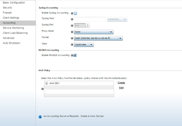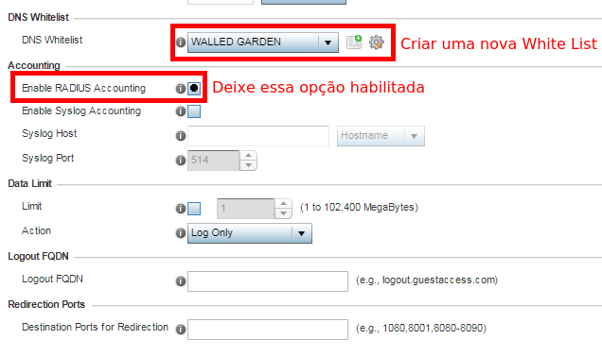 Na aba Accounting, dentro da WLAN, preencha como na imagem abaixo