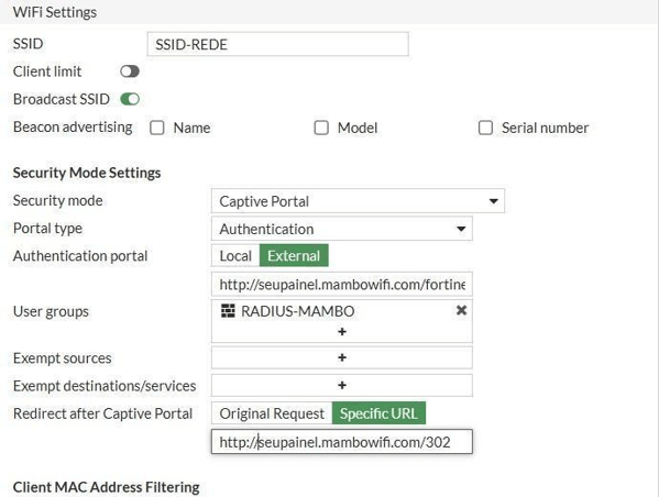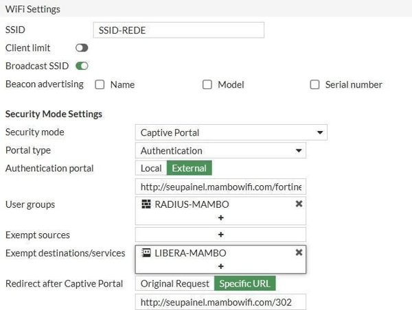 Authentication Porta: Externel → http://seupainel.mambowifi.com/fortinet