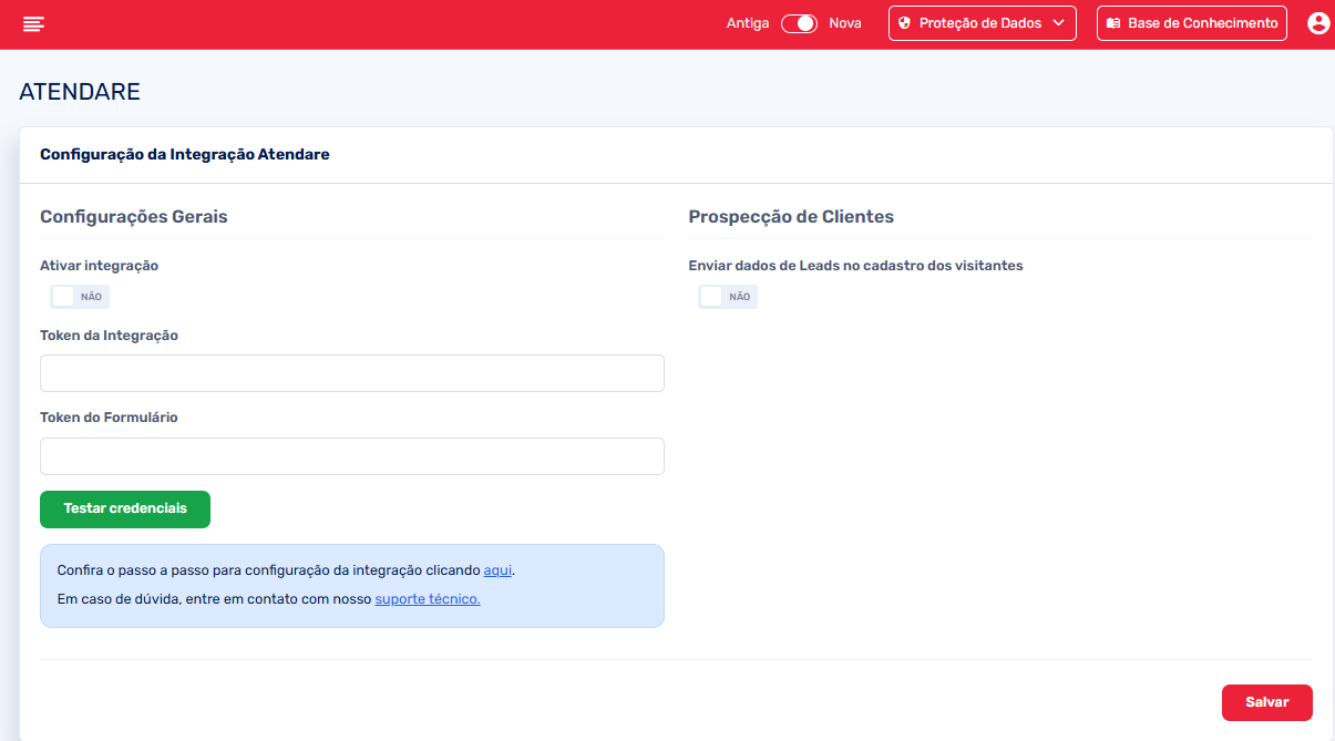 - Token da Integração (API): Esse token deve ser solicitado diretamente ao suporte da Atendare, pelo e-mail suporte@atendare.com, após obter este token insira no campo designado.