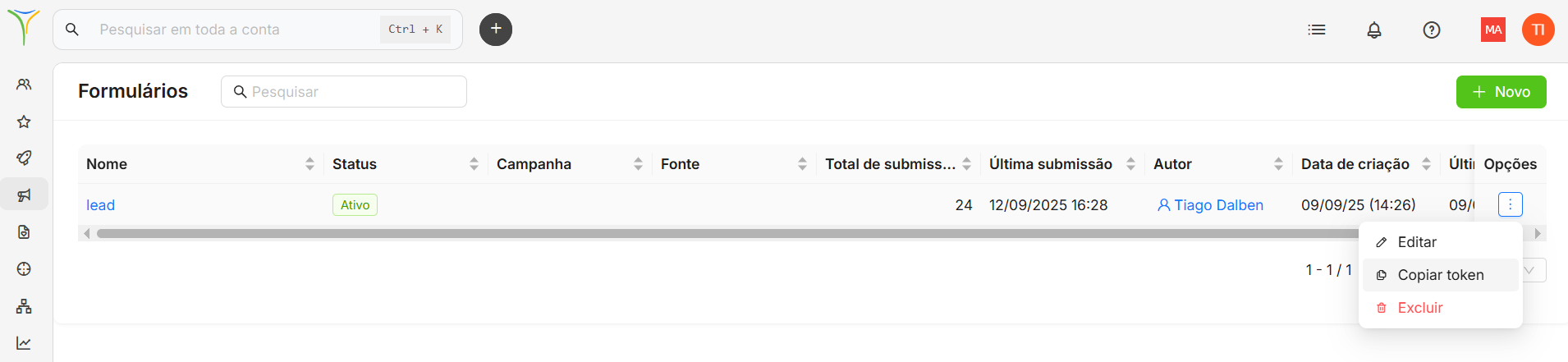 Após a criação do formulário clique nos “três pontinhos” → “Copiar token”.