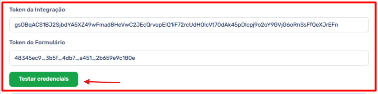 Após inserir os tokens clique no botão “Testar credenciais”.