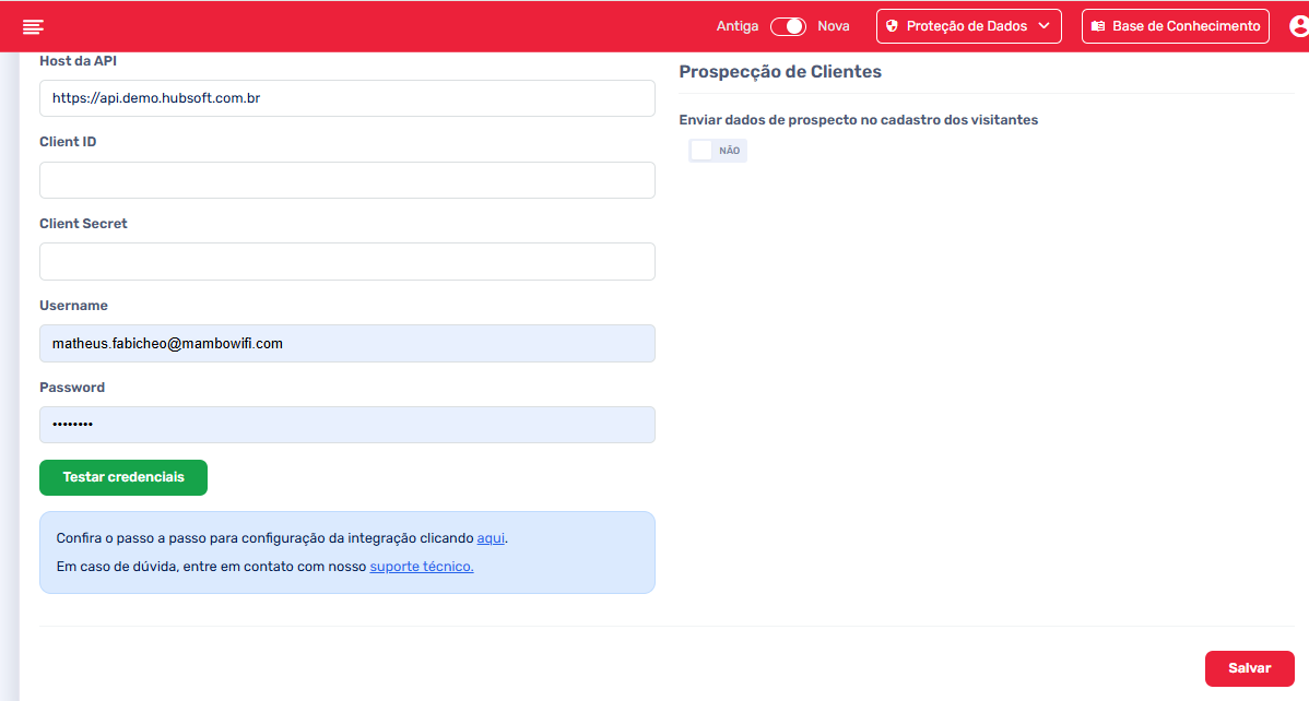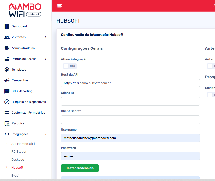 Para integrar o sistema Mambo com o HubSoft e enviar os usuários cadastrados no captive portal como prospectos, algumas informações precisam ser fornecidas corretamente. A seguir, estão as instruções necessárias para a integração.