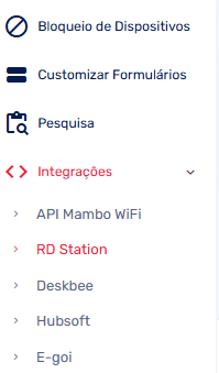 Para utilizar o RD Station com o Mambo WiFi é necessário realizar um cadastro em seu painel administrativo. Para isso, acesse seu painel Mambo WiFi, clique no menu Integrações e selecione RD Station: