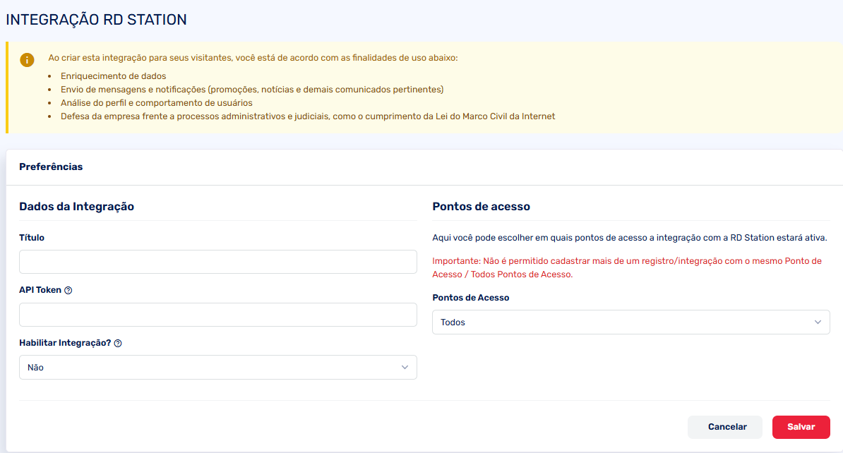 Pontos de Acesso: Selecionar em quais pontos de acesso estará ativa a integração com o RD Station.
