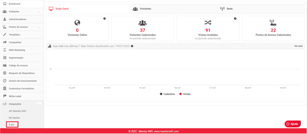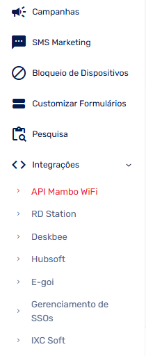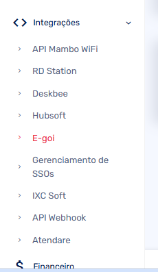 Para utilizar o E-goi com o Mambo WiFi é necessário realizar um cadastro em seu painel administrativo. Para isso, acesse seu painel Mambo WiFi, clique no menu "Integrações" e selecione E-goi.