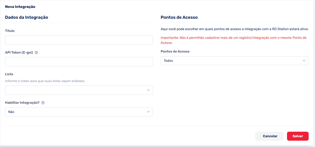 Pontos de Acesso: Em quais pontos de acesso estará ativa a integração com o E-goi.