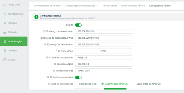 Ative a opção “Ativar Autenticação via Radius”