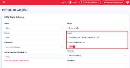Adicionar Endereço Físico ao Ponto de Acesso: Ao adicionar ou editar um ponto de acesso (AP), haverá um novo campo para inserir o endereço físico onde o AP está localizado. Esse endereço será utilizado para posicionar o ponto no mapa.