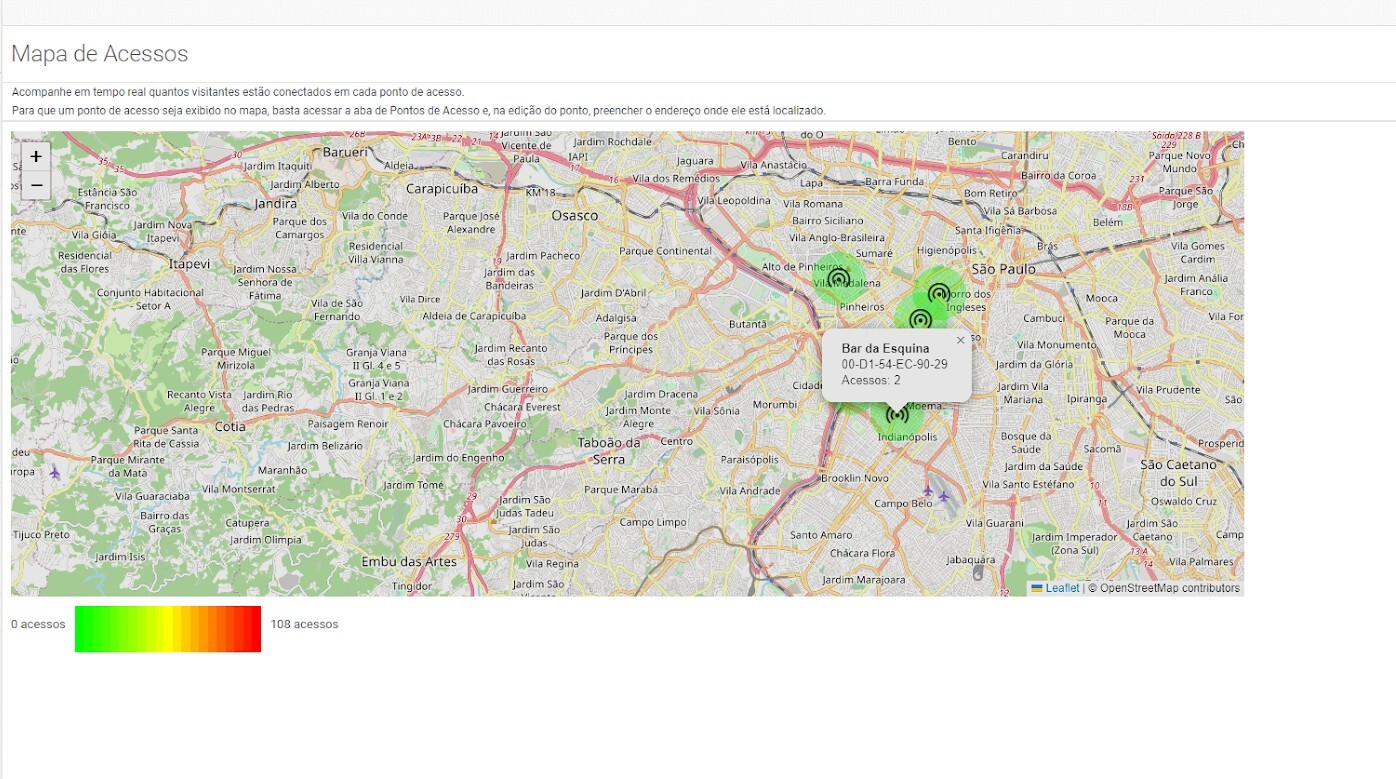 O Mapa de Acessos permite que o administrador visualize no mapa do Brasil a localização física de cada ponto de acesso (AP). Cada ponto é populado no mapa com base no endereço informado no cadastro do AP, e é possível visualizar, em tempo real, quantos visitantes estão conectados em cada local.