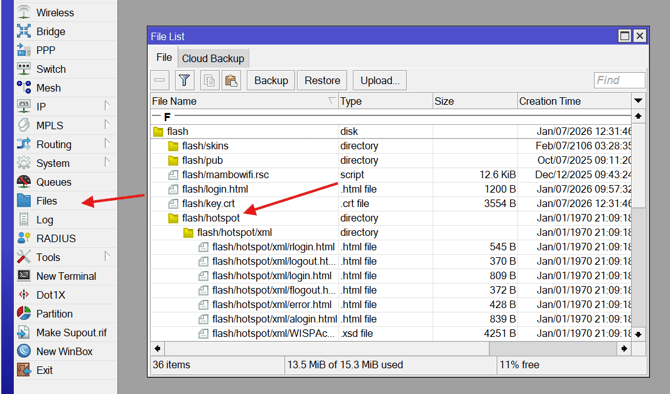 - Após o download extrai os arquivos em uma pasta de sua preferencia, acesse o Mikrotik pelo Winbox, clique em Files, insira os arquivos extraídos na pasta hotspot (alguns equipamentos