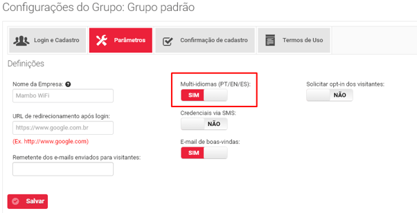 Clique em Configurações (ícone da engrenagem) referente ao grupo que deseja customizar. No exemplo será ativado o Multi-Idiomas do grupo padrão.