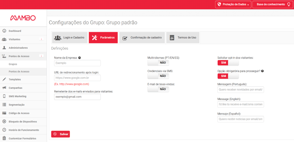 Você será redirecionado para a página "Configurações do Grupo". Nesta página vá até o menu "Parâmetros" e habilite a opção "Solicitar opt-in dos visitantes".