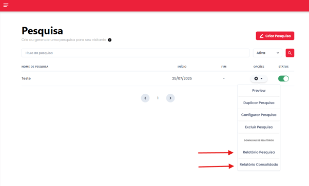 Para extrair relatórios, basta clicar no ícone de engrenagem (Opções) e selecionar Relatório de Pesquisa ou Relatório Consolidado. O formato do arquivo para download é .CSV