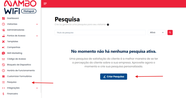 Para configurar uma pesquisa em seu painel, acesse seu painel administrativo e vá até o menu "Pesquisa". Depois, clique em "Criar Pesquisa".