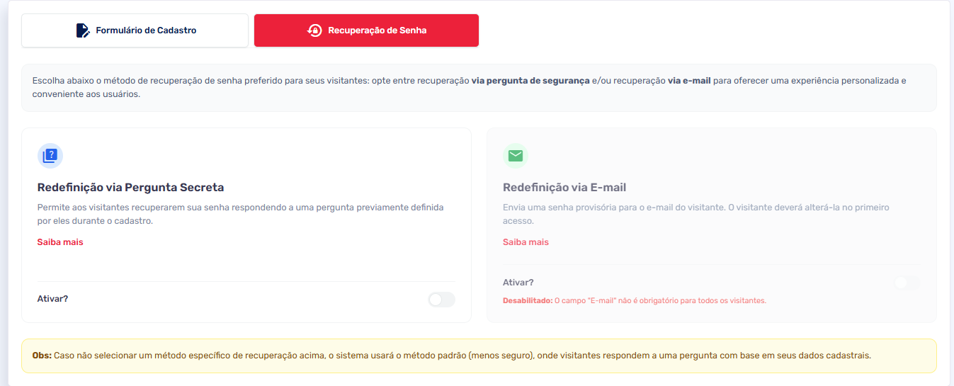Para utilizar essa funcionalidade é necessário que os outros métodos de recuperação (e-mail, pergunta secreta), estejam desativados.