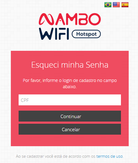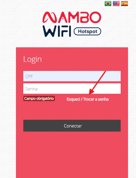 Após o Visitante acessar a rede e abrir o portal Mambo, ele poderá redefinir a senha clicando em "Esqueci/Trocar a senha"