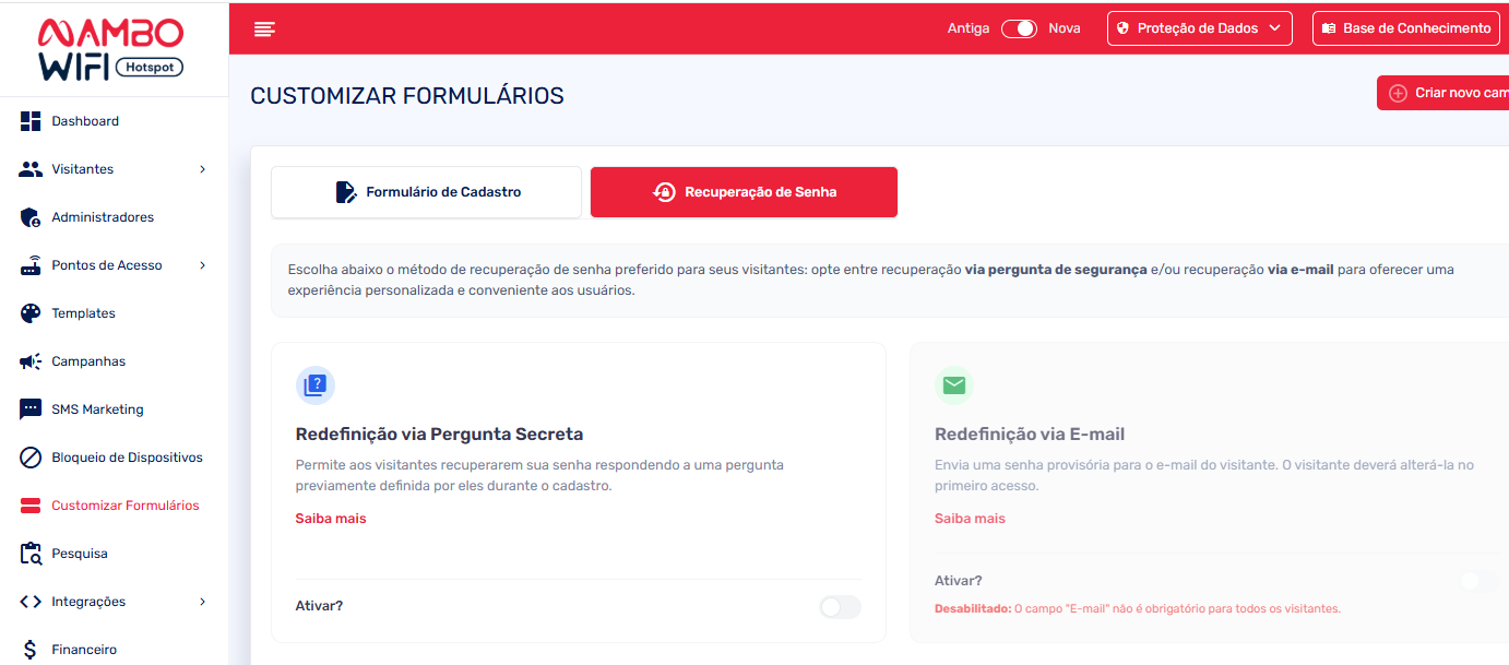 A ativação/desativação desse recurso fica na área administrativa no menu de “customizar formulário”, na aba "Recuperação de Senha":