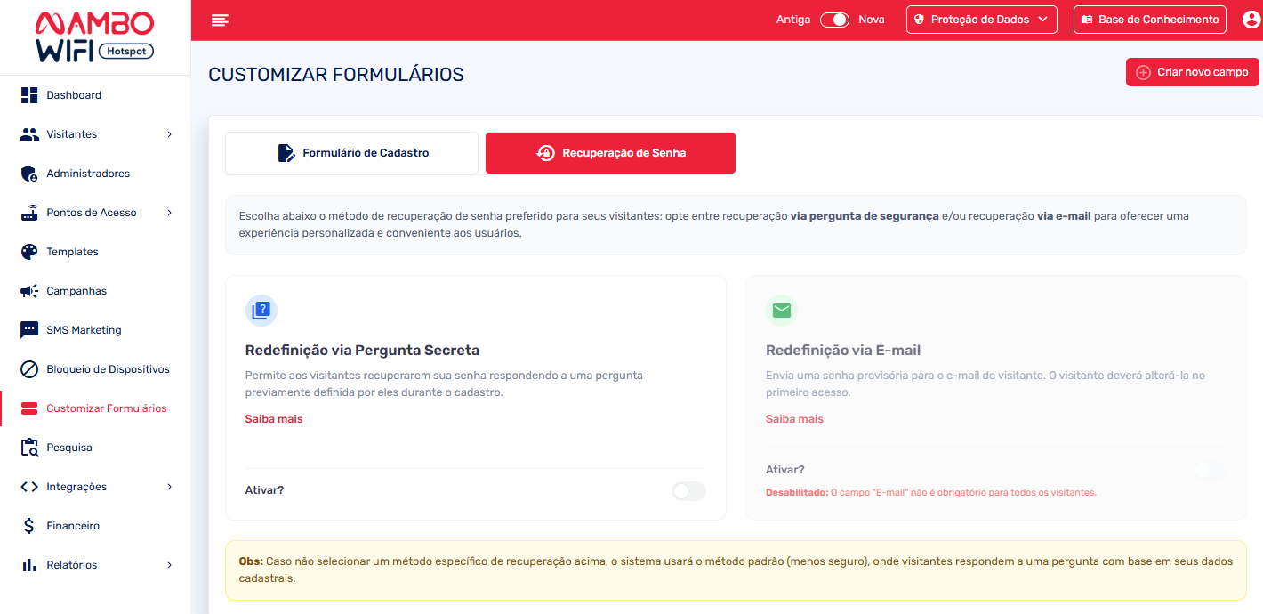 A ativação/desativação desse recurso fica na área administrativa no menu de “customizar formulário” na aba "Recuperação de Senha":