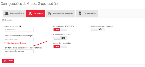Na segunda aba "Parâmetros" > e alterar o campo "Remetente dos e-mails enviados para visitantes:"