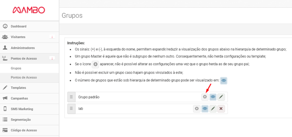 Para alterar o contato dos e-mails, você precisa ir até Pontos de acesso > Grupos (No caso do exemplo é o grupo padrão) > Configurações (ícone de engrenagem).