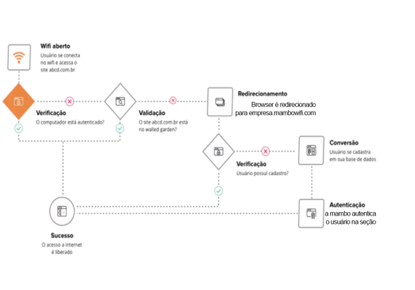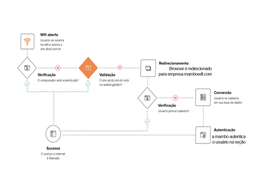 No fluxo abaixo, o item destacado em laranja é onde o captive portal realiza suas funções: