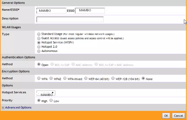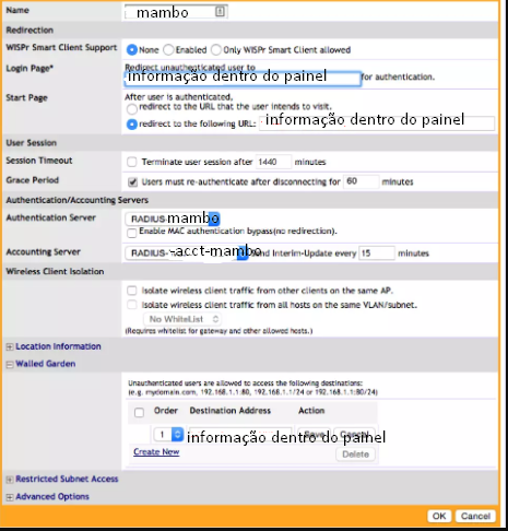 Acesse “Configure” -> “Hotspot Services” -> “Create New” e preencha conforme abaixo: