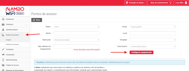 Acesse seu painel e navegue até “Pontos de Acesso” cadastre o ponto de acesso (edite se já estiver configurado), em seguida clique em “Configurar equipamento”