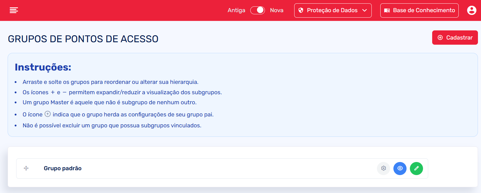 Todos painéis possuem um grupo padrão com algumas regras de negócios básicas e você pode criar um sub-grupo desse padrão ou de um outro grupo que desejar.