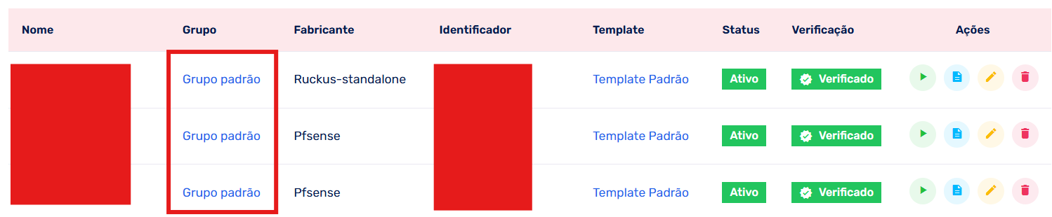 Para verificar quais grupos estão sendo utilizados, você pode verificar através dos pontos de acesso, indo até Pontos de acesso > Pontos de acesso e visualizar quais grupos estão atrelados aos pontos: